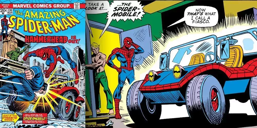 Otra creación de la Edad de Bronce que los fans ven principalmente como una broma es el Spider-Móvil. Debutó en la portada de Amazing Spider-Man #130. Incluso en esta portada de John Romita Sr., es destruido por Hammerhead, haciendo un servicio a Spider-Man.