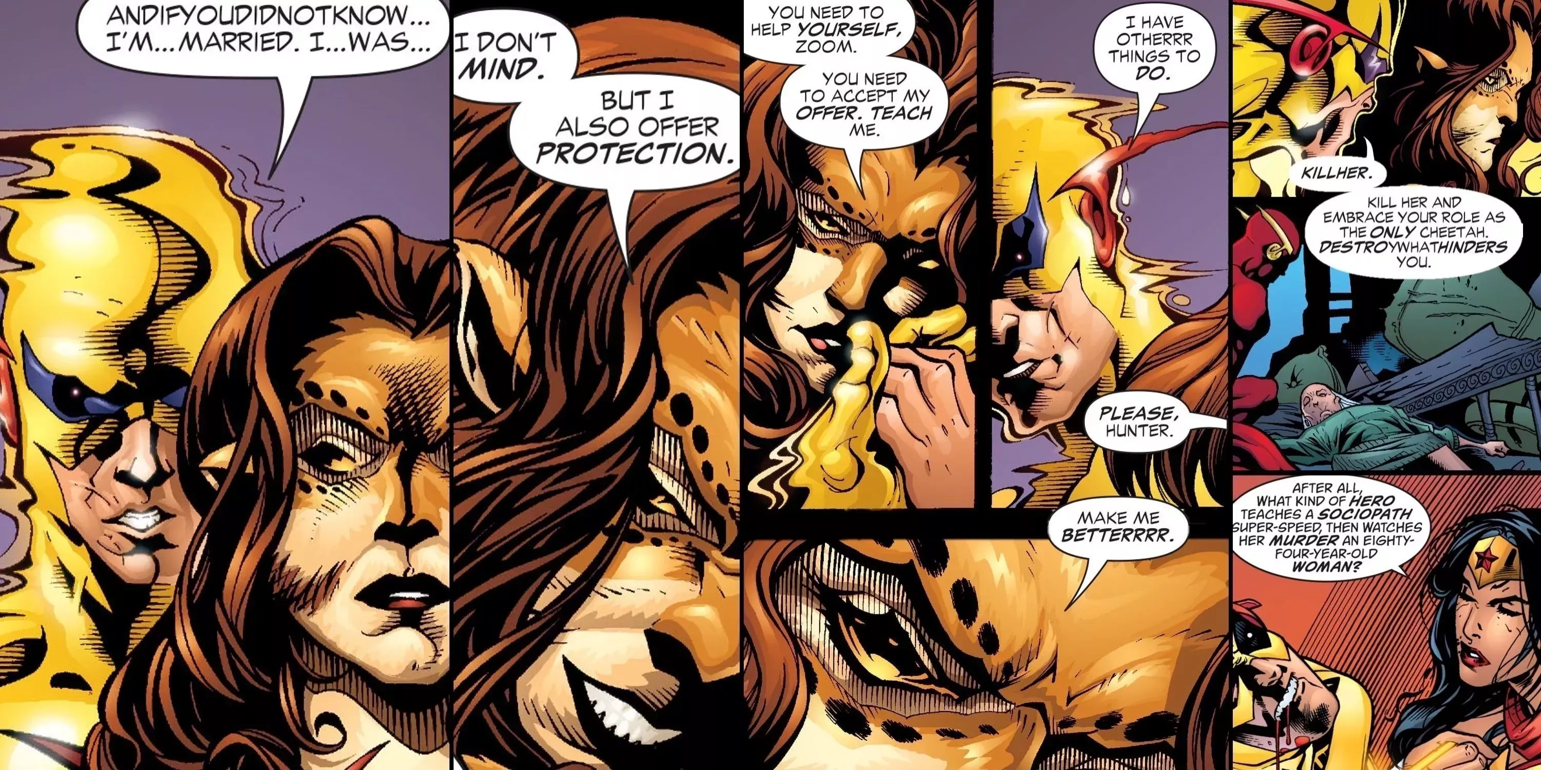 Zoom ayuda a Cheetah a alcanzar la supervelocidad, pero no antes de que su malvada asociación se convierta en algo sexual (aunque Hunter Zolomon todavía se considera casado). El autoproclamado "héroe" también aprovecha la oportunidad para incitar a Bárbara a que mate a Priscilla Rich, alegando que sólo podrá descubrir su verdadero potencial una vez que la Cheetah original haya desaparecido.