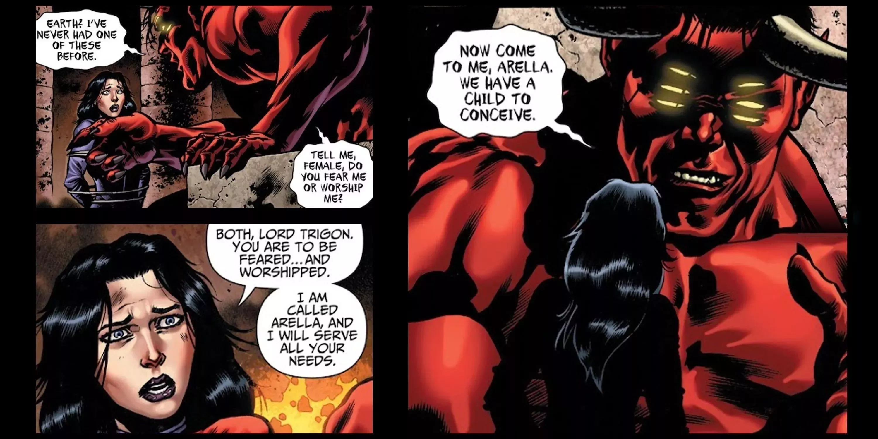 En busca de una comunidad que la aceptara, Arella se unió a un culto satánico. A través de un ritual del culto, conoció a Trigon, Destructor de Mundos, y éste la eligió para engendrar a su heredero. Arella se escondió de Trigon durante su embarazo y dio a luz a Raven, que se convirtió en una Teen Titan y ahora utiliza sus poderes como Cambion para detener a los malhechores (incluido su padre).