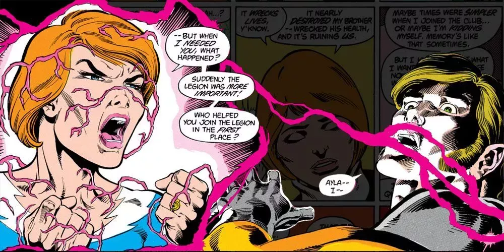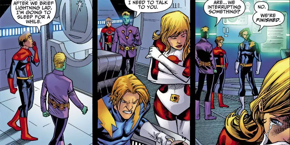 Saturn Girl se lo confes贸 todo a Lightning Lad. 脡l se enfad贸 y ella sali贸 de la habitaci贸n llorando. Brainiac 5 entr贸 inmediatamente despu茅s y pregunt贸 si interrump铆a algo. Lightning Lad respondi贸 con un g茅lido: "No, hemos terminado".