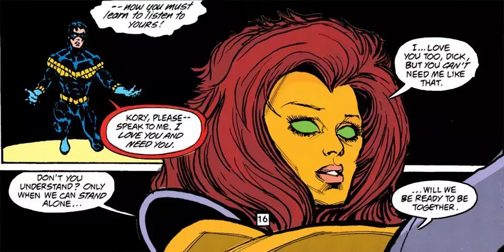 Starfire estaba preocupada por la voz de Raven, que constantemente se burlaba de su mente. Al vencer a su mente perturbada, se dio cuenta de que no pod铆a quedarse con Nightwing hasta que se hubieran encontrado a s铆 mismos como individuos. Se volc贸 en su herencia tamaranea y, cuando se recuper贸, segu铆a sintiendo que Nightwing y ella necesitaban estar separados.