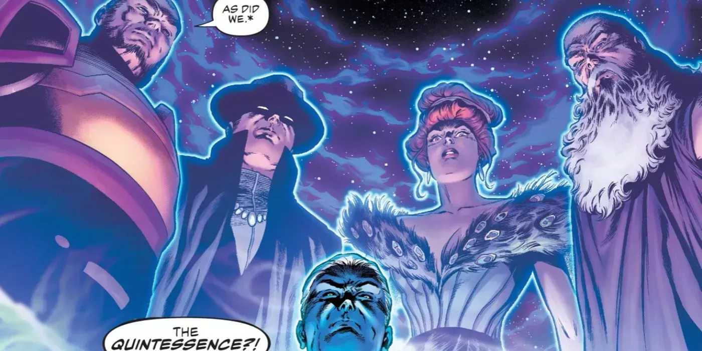 La Quintaesencia, a diferencia de otras sociedades secretas de DC, cuenta con personajes alineados mayoritariamente con el bien. Este grupo está formado por algunos de los seres más poderosos de todo el universo DC. Todos ellos inmortales y cósmicos, entre sus miembros se encuentran Phantom Stranger y un Guardián de Oa.