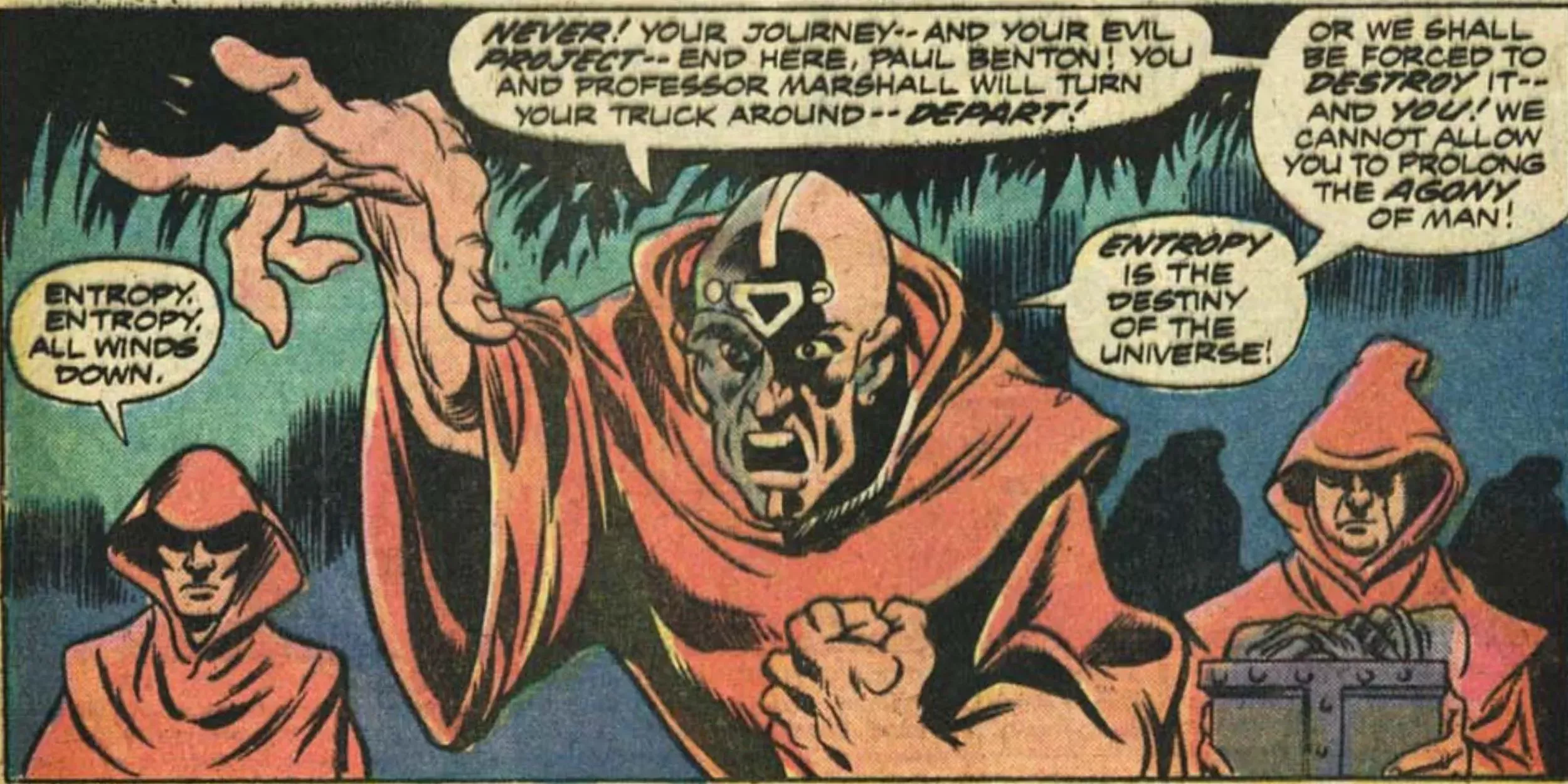 El Culto de la Entropía no es más que una de las muchas ridículas sociedades secretas y sectas creadas para Marvel por Steve Gerber durante sus largos años en la editorial. El concepto de cultos ridículos, como este, pronto se convirtió en un elemento básico de las historias de Man-Thing y Howard.