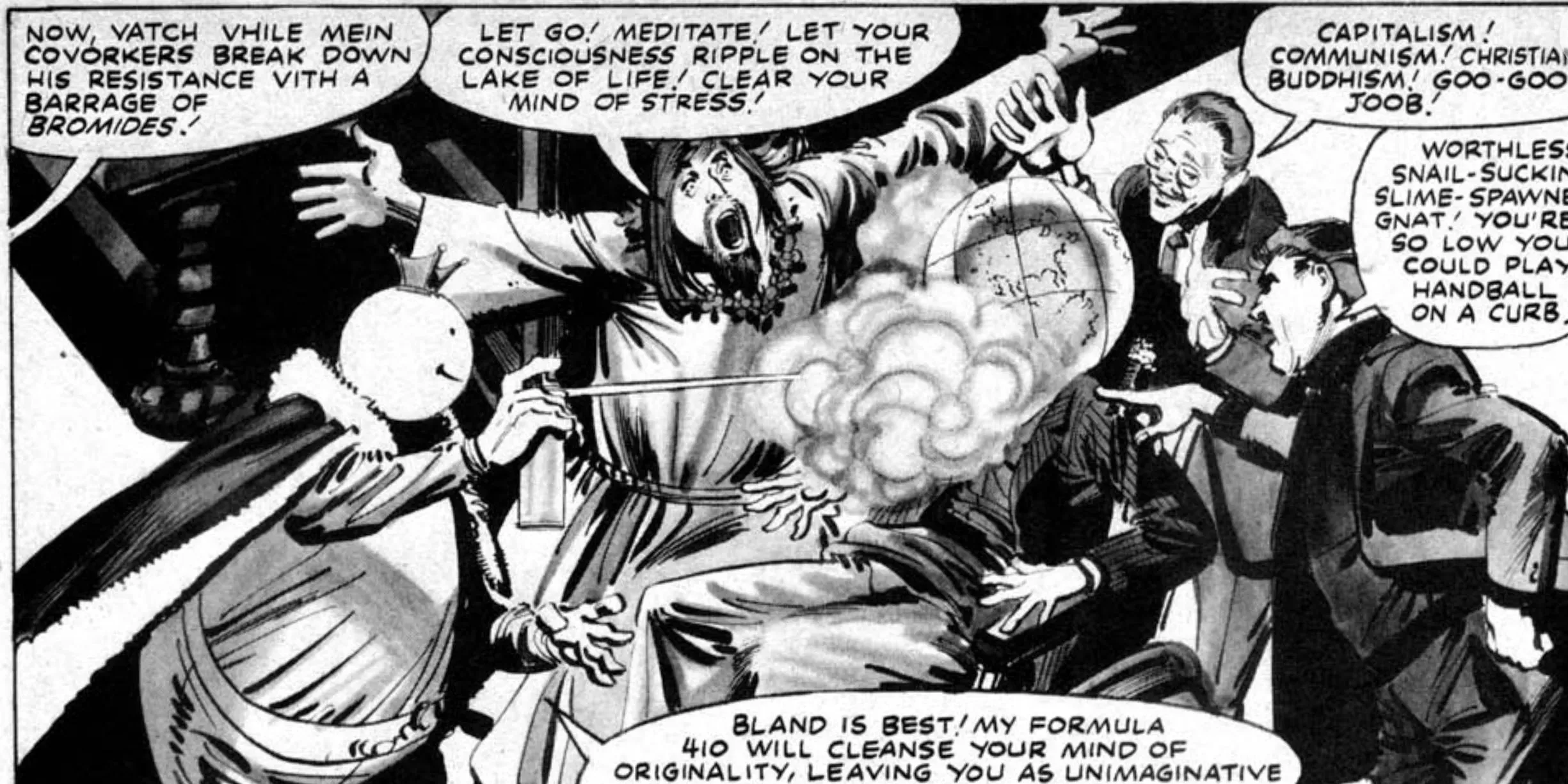 S.O.O.F.I. fue una de las varias organizaciones absurdas que revelaron su interés por acabar con la vida de Howard a lo largo de este disparatado libro. Eran emblemáticos de la forma en que los cómics podían jugar con los estereotipos y las convenciones narrativas.
