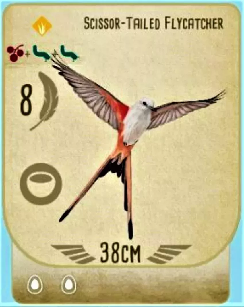 El papamoscas de cola en tijera es un ave de aspecto muy singular, y su aspecto maravillosamente extraño se capta perfectamente en la representación que hace de él Wingspan. Cuando están posados en una rama, estos pájaros parecen aviares indistintos del tamaño de un gorrión. Sin embargo, su verdadera belleza sale a relucir cuando vuelan. Su cola se despliega en abanico detrás de ellas, lo que les ha valido su nombre, y sus plumas de color naranja vibrante bajo las alas añaden un toque de color y enmarcan perfectamente su cuerpo. Con las patas recogidas, parecen un cruce entre un pájaro y una mariposa.