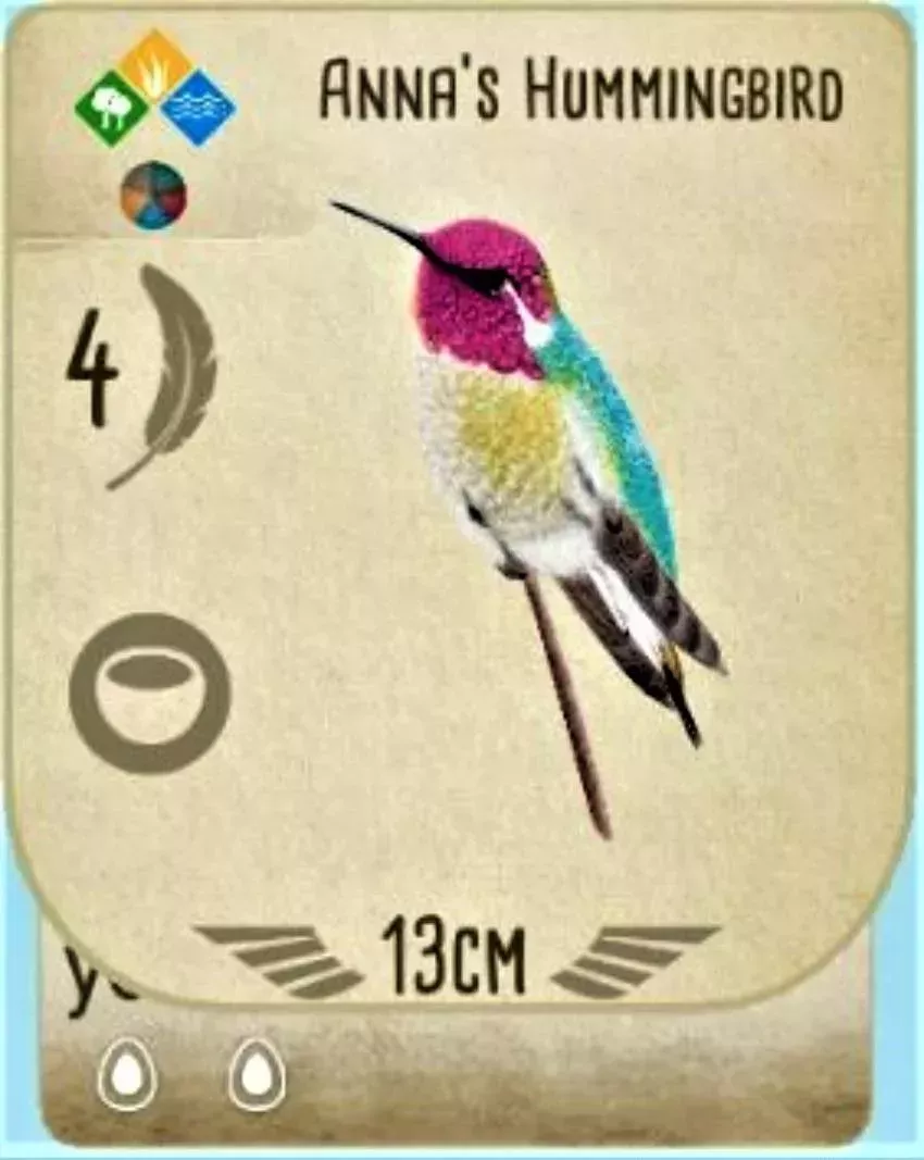 El colibrà de Anna es una de las especies de aves más emblemáticas de Wingspan. Su brillante colorido ha inspirado a muchos artistas a pintarlos, convirtiéndolos en una de las primeras aves en las que piensa la gente cuando piensa en colibrÃes. Aunque la mayorÃa de las veces se representan con sus plumas verdes y rosas, estos pájaros tienen en realidad una gran variedad de colores, algo que Wingspan capta muy bien.