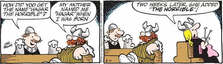 Esta tira es especial. Principalmente porque no fue dibujada por Dik Browne, creador de la tira, sino por su hijo, Chris, quien decidió encargarse de dibujar la tira tras la muerte de su padre en 1989. También es especial porque discute el origen del nombre de Hagar. Mientras está sentado en una taberna bebiendo una cerveza, un tabernero le pregunta a Hagar el origen de "Hagar el Horrible." Sin embargo, es interrumpido de repente por su esposa en el siguiente panel, quien se revela que también está en la taberna. En lugar de beber, sin embargo, ella se sienta tejiendo a un lado.