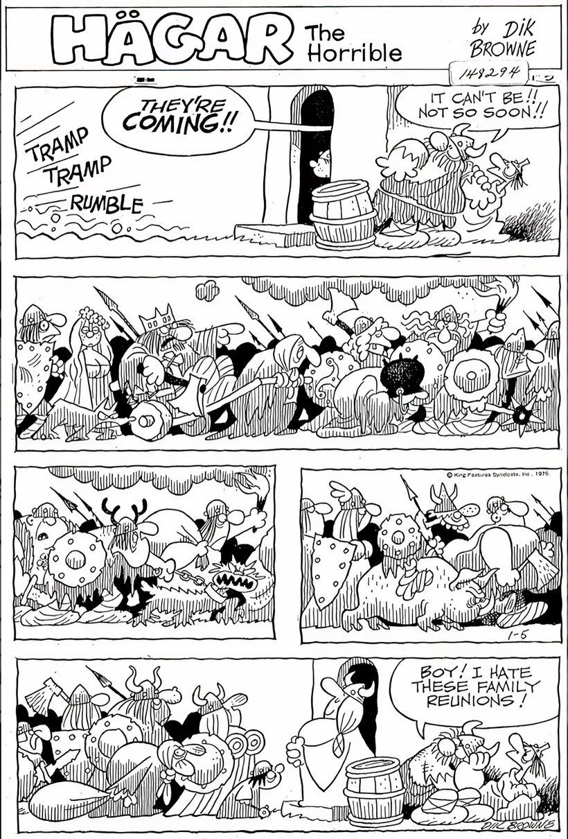 La familia que viene a visitar puede ser divertida si su compañía es bienvenida. Sin embargo, Lucky Eddie y Hagar están descansando fuera de la casa de Hagar en esta tira extendida. De repente, los siguientes cuatro paneles están inundados por multitudes de vikingos con armas y escudos. Al detenerse ante una sonriente Helga, Hagar lamenta: