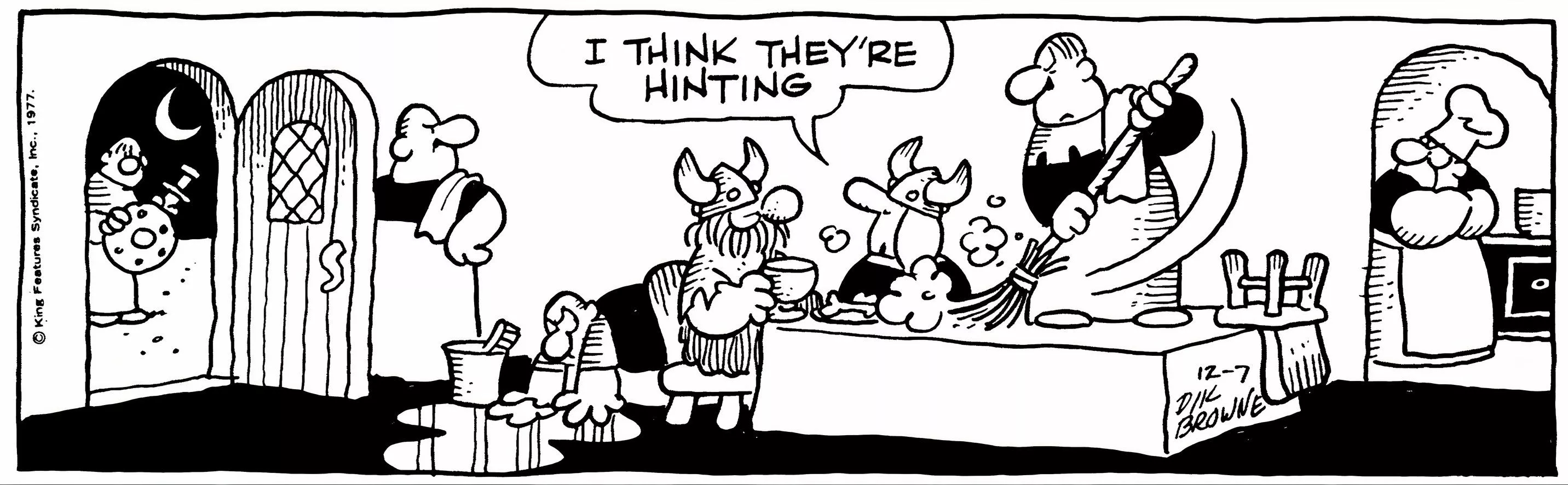 "Creo que están insinuando," le dice Helga a su marido mientras se mantiene plácidamente tranquila. Hagar se mantiene igualmente despreocupado. La puerta abierta del restaurante (sostenida abierta por un miembro del personal enojado) muestra el cielo nocturno en el fondo, comunicando lo tarde que es y cuánto tiempo se han quedado la pareja. Es gracioso ya que es una situación muy real de los tiempos modernos. Aunque es la Edad Media, este panel demuestra la situación que la mayoría de los lectores han experimentado al menos una vez, y la tensión de todo ello está perfectamente encapsulada en esta tira, haciéndola tanto divertida como relatable.