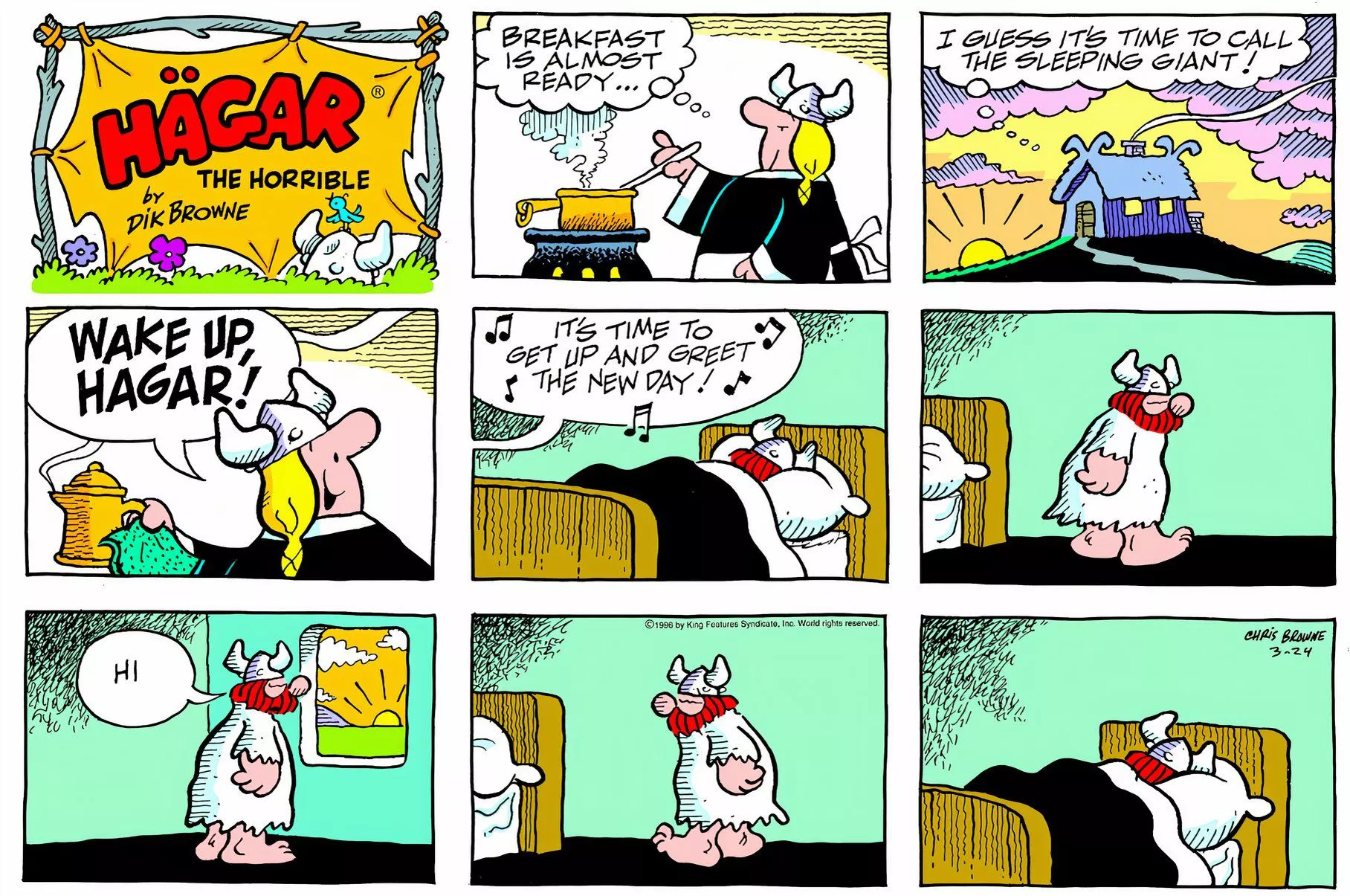 Helga prepara feliz el desayuno para su familia mientras sale el sol en una parte no especificada de Noruega. Por supuesto, no todos en el hogar están tan felices como Helga de levantarse con el sol. Su intento de sacar a Hagar de la cama no va bien, aunque todavía hace un intento por complacer a su esposa.