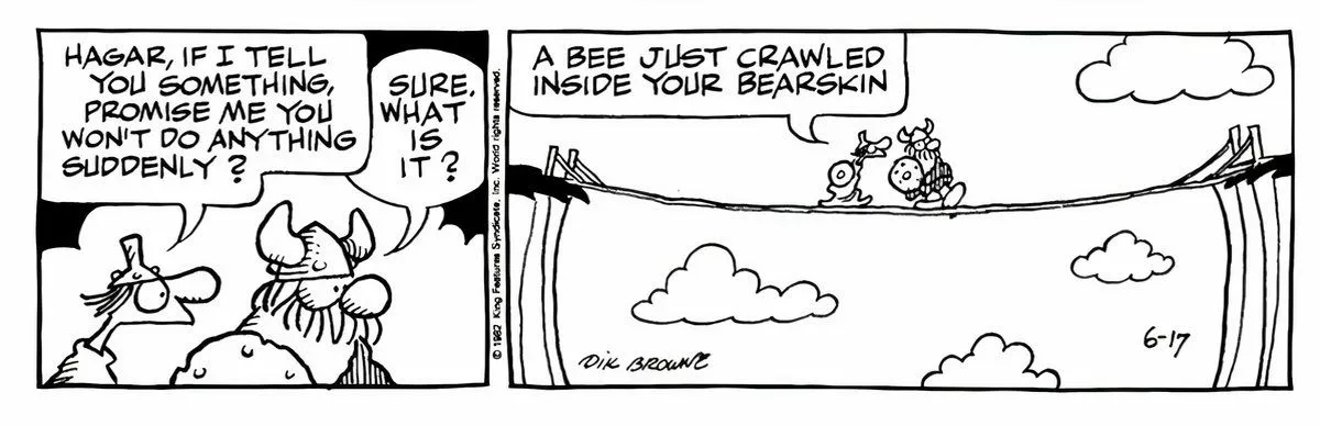 Estos paneles mantienen ritmos perfectos para la comedia. Eddie revela que una abeja entró en la armadura de Hagar, ya que la escena está completamente desplegada. La escena termina antes de que los lectores puedan ver cómo reacciona Hagar, aunque es bastante claro solo por la pequeña ilustración del vikingo, congelado y con los ojos abiertos, que su reacción no será leve. Tiras como estas realmente muestran lo divertida y magistral que era Browne con su tira cómica y la habilidad que tenía para colocar punchlines. Esta tira ocupa el lugar del medio porque demuestra el uso ingenioso de los paneles para entregar chistes.