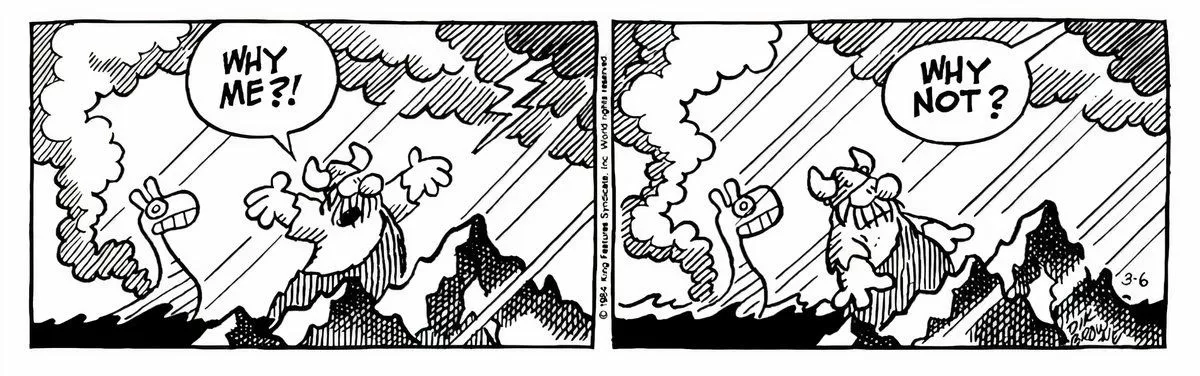A menudo, las personas hacen la pregunta retórica, "¿Por qué yo?" cuando algo desafortunado les sucede. Por supuesto, no suele suceder que otros tengan una respuesta o una razón que dar. En esta hilarante tira de dos paneles, Hagar acaba de estrellar su barco vikingo en medio de una peligrosa tormenta. De pie sobre una roca bajo la lluvia incesante, Hagar grita: "¿Por qué yo?!"