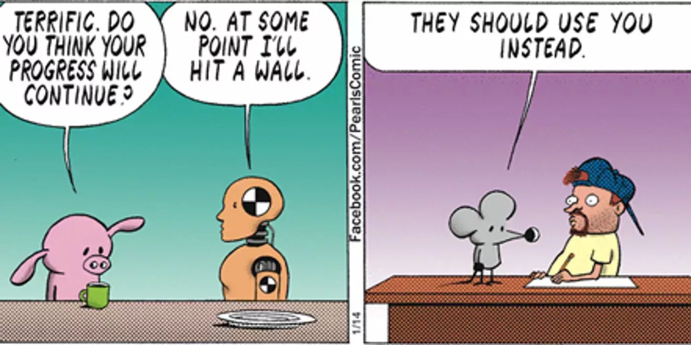 En un clásico montaje y remate de tres paneles, Pig habla con un maniquí de pruebas de choque y le pregunta cómo va su trabajo. Tras expresar que ha hecho progresos, el muñeco dice: "En algún momento, chocaré contra un muro", lo que constituye un hilarante doble sentido que es a la vez literal y metafórico en cuanto a la vocación del muñeco. La mejor parte llega al final, cuando la muy poco divertida Rata declara a Pastis: "Deberían usarte a ti en su lugar".