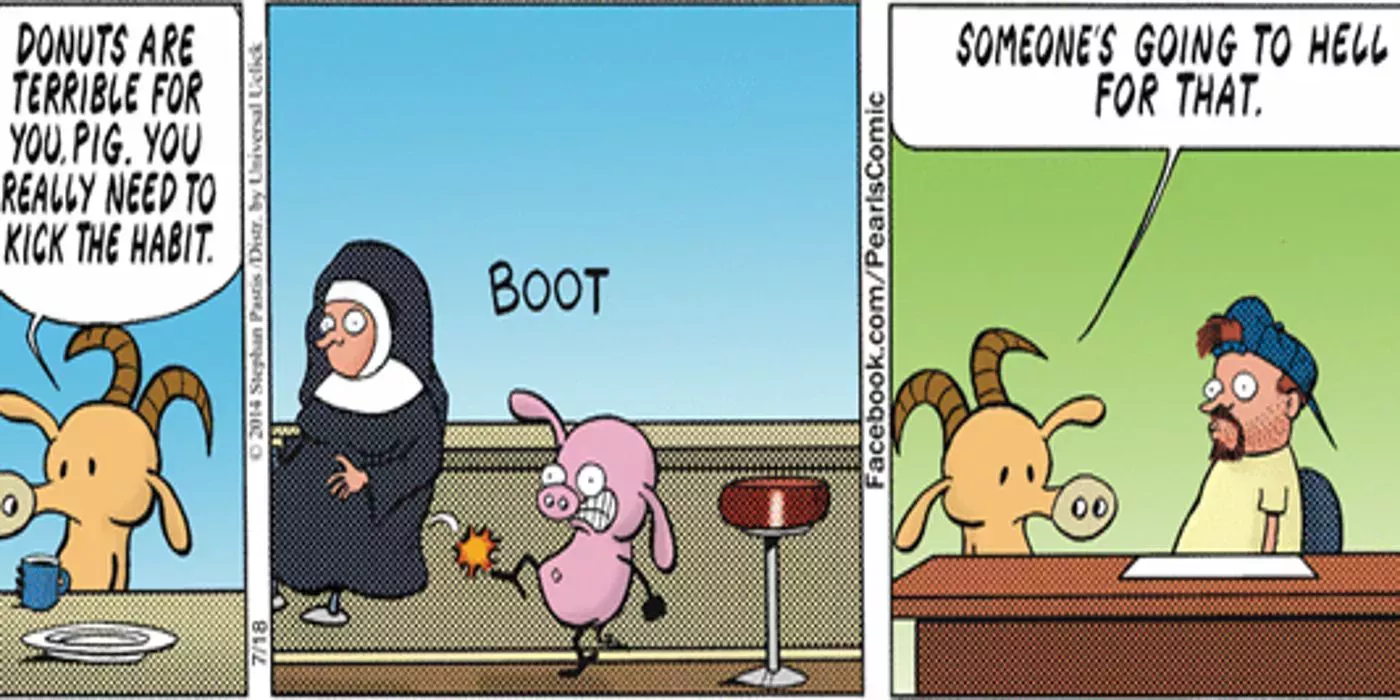 Aunque a los lectores no religiosos les pueda pasar desapercibido, un hábito es el nombre que recibe la larga y holgada toga de una monja. Cuando Cabra anima a Cerdo a "dejar el hábito", el porcino confunde el consejo con una orden de arrancar físicamente a una monja. El chiste termina con la ocurrencia característica de Cabra de que alguien "se va al infierno", lo que da un toque irreverente a la tira.