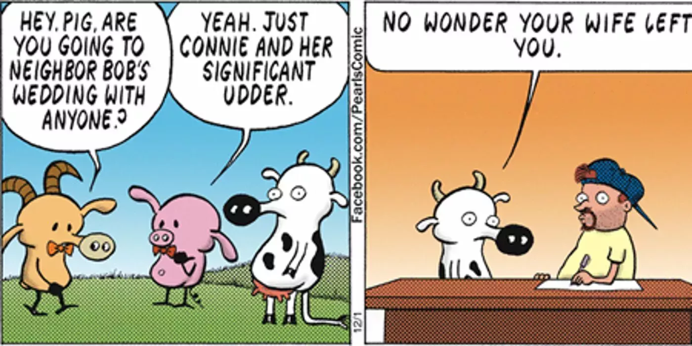 Pig y Connie Cow tienen a menudo una divertida interacción en la gran tira cómica de todos los tiempos. En un caso inolvidable, Pig invita a Connie a la boda de Bob. Connie acepta con la condición de que sus grandes ubres no sean un problema.