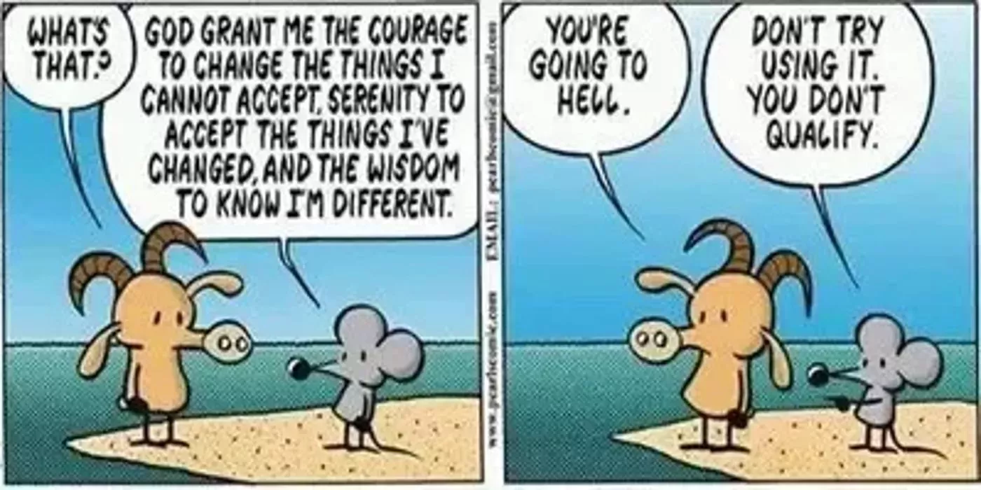 Después de que Rata cite completamente mal la Oración de la Serenidad, demostrando que está lejos de ser un genio, Cabra le estalla con su eslogan característico: "Te vas a ir al infierno" La tira sería lo suficientemente divertida si terminara ahí, pero Rata redobla su ignorancia afirmando "No intentes usarlo. No cumples los requisitos", lo que refuerza la química entre los dos animales.