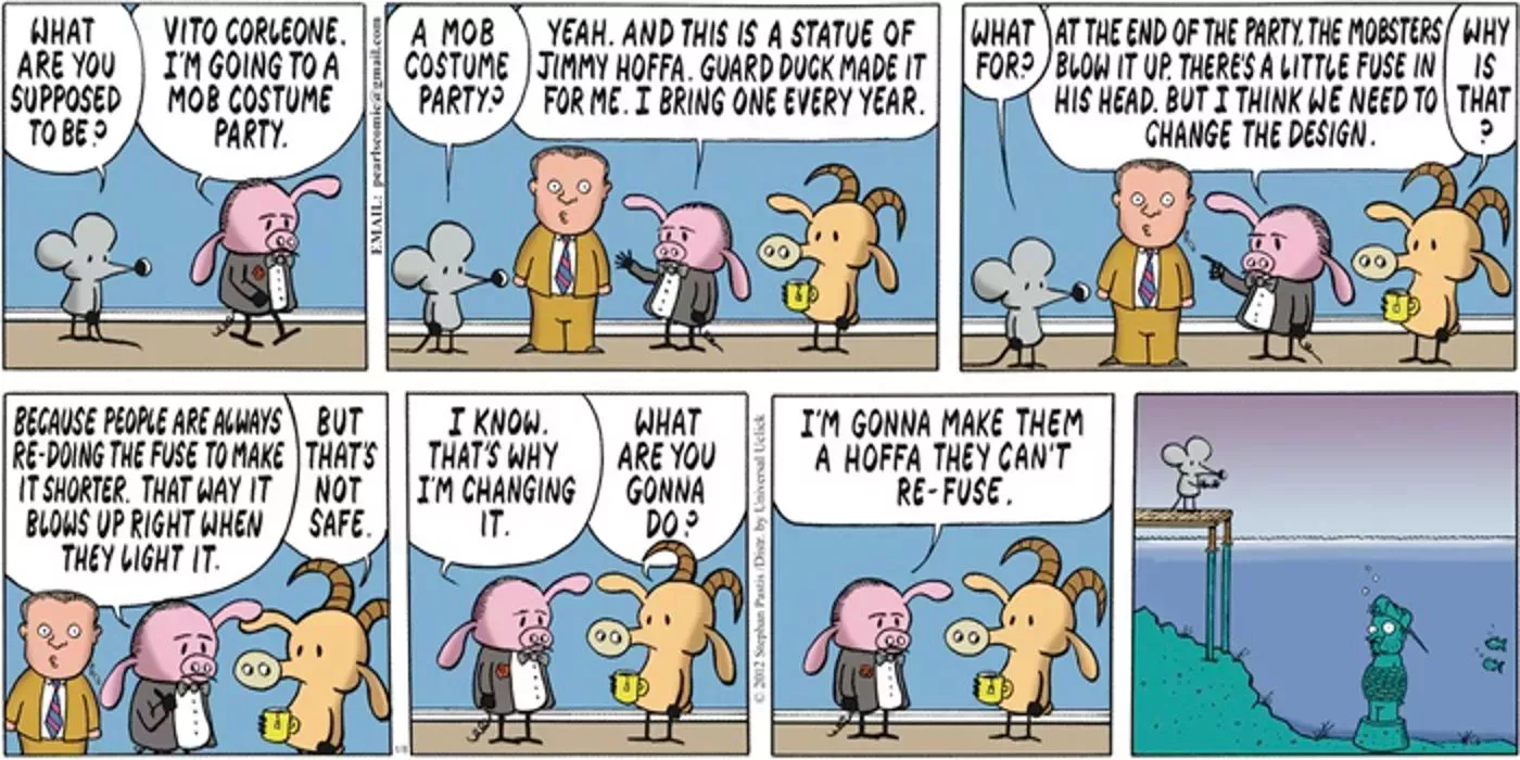 Pastis se apartó de la típica dinámica de tres viñetas para ofrecer una de las más divertidas parodias de la mafia en una tira satírica de siete viñetas. La trama gira en torno a Pig, que se disfraza de mafioso para una fiesta de disfraces de la mafia, y Rat se burla de él por llevar a la gala un muñeco hinchable de Jimmy Hoffa.