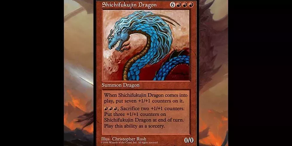"Shichifukujin Dragon" es una carta única e increíblemente rara de Magic: The Gathering creada en 1996 como amuleto de buena suerte para la inauguración del Centro Internacional de Torneos de la Convocatoria de Duelistas de Tokio. La única petición era que la carta fuera funcional con una mecánica realmente útil.