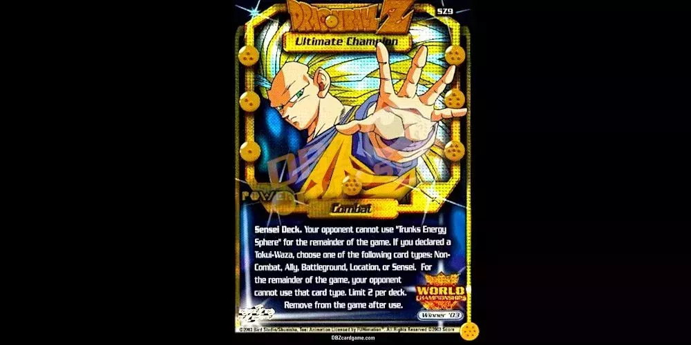 A principios de la década de 2000, parecía que cada propiedad importante estaba haciendo un juego de cartas coleccionables, y Dragon Ball Z no fue una excepción. El premio del torneo del Campeonato Mundial de DBZ de 2003 era "Campeón Definitivo", que otorgaba al usuario la capacidad de prohibir todas las cartas de un tipo de su elección del mazo de su oponente, con lo que básicamente ganaba la partida.