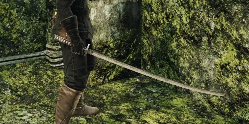La uchigatana es la primera katana que aparece en Dark Souls y es un arma muy letal. Es rápida, inflige un gran daño por golpe y tiene una escala excelente con la Destreza. Además, inflige daño de hemorragia que puede eliminar repentinamente una parte de la barra de salud del enemigo, lo que ayuda a introducir a los nuevos jugadores en los efectos de estado de Dark Souls.