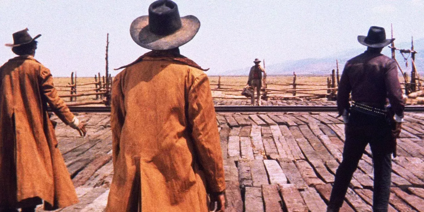 Érase una vez en el Oeste, de Sergio Leone, es una revisión magistral del género del spaghetti western popularizado por la Trilogía del Dólar. La secuencia inicial se compone de planos cercanos y lejanos, que mezclan vistas aéreas del árido paisaje con un enfoque casi microscópico tanto de los rasgos faciales como de la maquinaria.