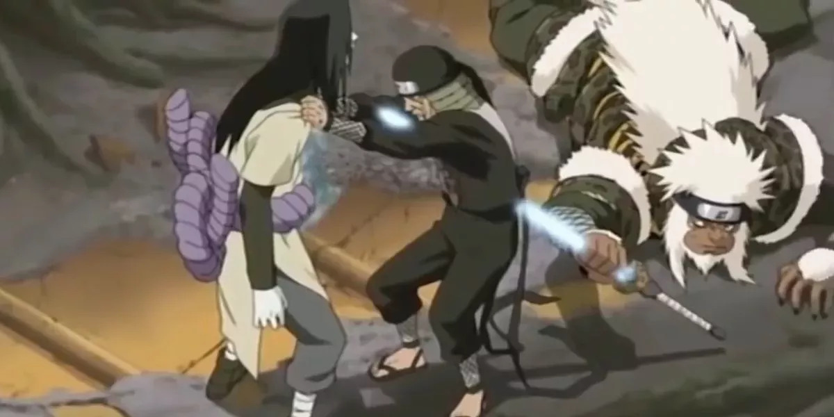 Esta es una de las batallas más caóticas de la historia anterior a Shippuden , y en ella participan los tres famosos Sannin, o los legendarios tres ninjas Orochimaru, Jiraiya y Tsunade. Es una batalla sin cuartel que sacude la tierra.