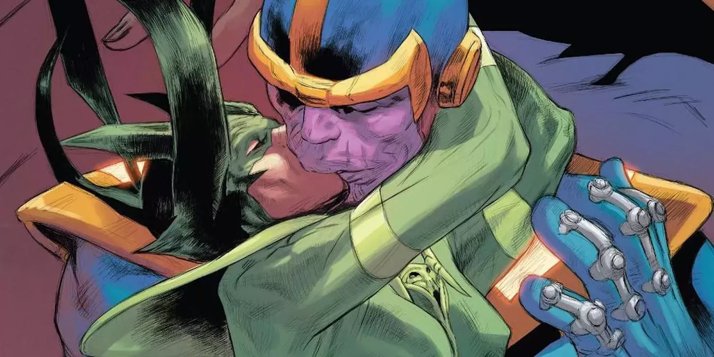 Thanos y Hela compartieron un apasionado beso después de que ella perdiera el trono de Hel, el Inframundo asgardiano. Se vio obligada a demostrar su valía a Thanos acabando con dos de sus colaboradores más competentes justo delante de él. El caos demostró ser el camino al corazón de Thanos, y no hubo gesto más apropiado para unir a estos dos villanos.