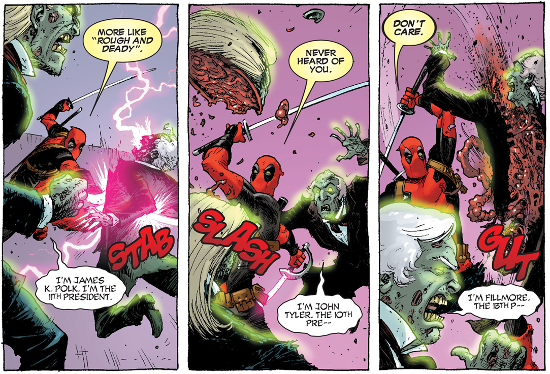 'Presidentes Muertos' de Gerry Duggan, Brian Posehn y Tony Moore: Inicio de la más longeva etapa del personaje, la cual se extiende hasta la actualidad, y ha dejado por el camino sagas tan demoledoras como 'El Bueno, El Malo y El Feo', locuras como 'Hasta que la Muerte Nos Separe' o la inclusión de Wade Wilson como patrocinador de los Imposibles Vengadores -por no hablar de derivados varios, desde mini series con otros personajes como Ojo de Halcón a grupos derivados como los Mercenarios a Sueldo-, Gerry Duggan tendría el acierto de acordarse de que el personaje era mucho más que una broma, recuperando desde su aspecto más trágico hasta el más aterrador como imparable máquina de matar de desquiciada locura. Repleta de contrastes, y sabiendo compaginar las diferentes facetas e historia que el mercenario bocazas había sumado a lo largo de sus veinti tantos años de historia, la etapa de Gerry Duggan arrancaría con este desmadrado arco en el que Wade sería reclutado por SHIELD para acabar con la vida de todos los presidentes Muertos de los Estados Unidos, los cuales habrían sido resucitados y convertidos en una amenaza para la nación. Una saga con una negrísima mala leche, la cual si bien es solo un pequeño anticipo de todo lo bueno que estaba por llegar, ya dejaba claro que nadie mejor para escribir Deadpool que alguien que para hacerlo tenía como principales referentes Howard el Pato de Steve Gerber y Watchmen de Alan Moore.