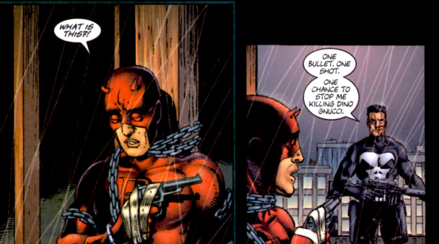 Welcome Back, Frank: Tras años en declive, Garth Ennis y Steve Dillon cogieron las riendas del personaje tras finalizar su histórica etapa en 'Predicador', desmontándolo de la cabeza a los pies con esta saga pasada de rosca y llena de excesos, en la que tan pronto veías encontrábamos escenas tan gloriosamente chanantes como Castle tumbando a un oso polar de una hostia o la introducción de El Ruso, que a Punisher y Daredevil volviéndose a ver las caras en un enfrentamiento crucial para la segunda temporada del personaje. Aquella saga de 12 números solo fue el comienzo, no tardando en verse continuada con las sagas como 'Frank', 'La Conjura de los Necios' o 'El Retorno de Ma Gucci'.