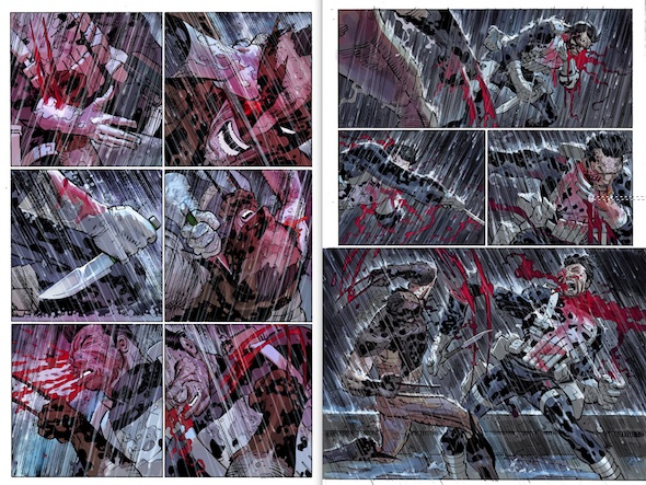 Reinado Oscuro / La saga de Franken Castle / En la Sangre: Como consecuencia de la primera Civil War, Punisher volvió a codearse con el resto del universo Marvel, por cortesía de una desmadrada serie con tan buenos momentos -aquel “Y me llaman loco a mi... Soy el tipo más cuerdo de esta maldita ciudad”- como ideas peregrinas. Pese a sus virtudes puntuales, esta etapa difícilmente podría incluirse entre las mejores del personaje, pero sí a la que vino después, en la que Rick Remender sabría aprovechar lo que suponía tener a un personaje con una motivación tan dura y real como las circunstancias que supusieron la muerte de su familia con el disparatado marco de superhéroes y villanos pintorescos de Marvel. Con el ascenso de Osborn, Castle se vería perseguido por una legión de villanos resucitados, para acabar enfrentándose con lo que solo puede definirse como la peor de sus pesadillas: La posibilidad de que su familia volviese a la vida, y lo viese convertido en quien es ahora. Lo que sigue es una espiral de horror, mutilación, muertes absurdamente violentas, monstruos de serie B, islas perdidas y mucha serie B desmadrada, pero que a la vez esconde una interesantísima introspección del personaje, haciéndole enfrentarse al monstruo en el que se ha convertido y ver la oportunidad de ser algo más que un agente de la muerte, para concluir con su apoteósico choque final contra los hermanos Russo.