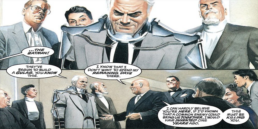 Aunque no es un antagonista principal de Bruce Wayne, Lex Luthor y Batman han entrado en conflicto directo antes, por lo general a través de negocios de la Liga de la Justicia y extensivamente durante No Man's Land, cuando Luthor trató de comprar la mayor parte de una Gohtam City devastada por un terremoto. Sin embargo, la política hace extraños compañeros de cama, y en Kingdom Come, el Caballero Oscuro y Luthor forman una alianza incómoda para detener la influencia de los meta-humanos en los asuntos mundiales.