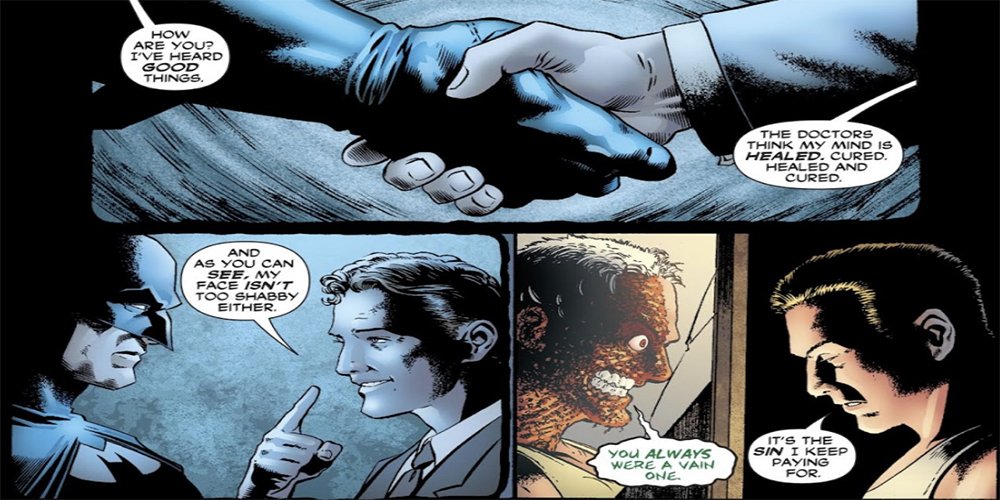 Además, en Face the Face, el Caballero Oscuro entrena a un Harvey Dent reformado para que ocupe su lugar en el año de ausencia que tomó después de los eventos de Crisis Infinita. A pesar de su antagonismo, Batman y Doble Cara parecen ser capaces de trabajar juntos a veces, recordando los comienzos de su relación.
