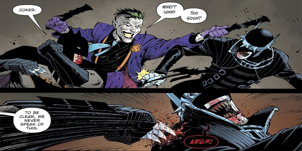 El más reciente fue durante los Caballeros Oscuros: Metal crossover, que presentaba prominentemente una versión de Dark Multiverse de Bruce Wayne que había sucumbido a la toxina del Joker. Llamado The Batman Who Laughs, Batman estaba tan desesperado por derrotar a este nuevo y mortal adversario, que se alistó en The Joker para que le ayudara. El equipo tuvo éxito, ya que fueron capaces de derrotar a The Batman Who Laughs y evitar que destruyera la realidad.
