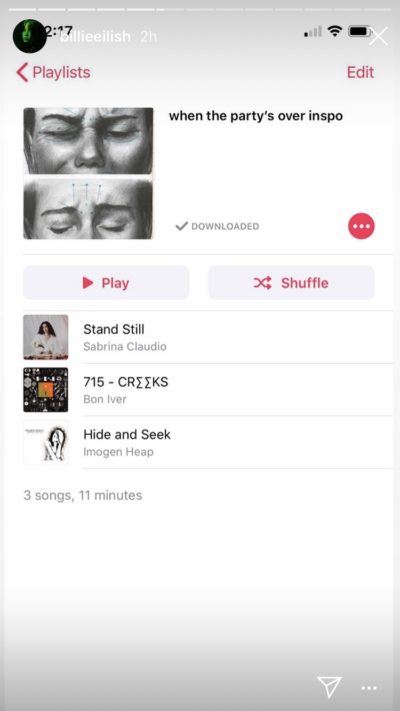 Billie Eilish ha estado compartiendo listas de reproducción personales de canciones que influyeron en los temas de su álbum debut. Llevando a Instagram Stories hoy temprano (25 de marzo), la estrella del pop preguntó a sus fans si les gustaría ver las "listas de canciones que inspiraron cada canción" que aparecen en el aclamado 'When We All Fall Asleep, Where Do We Go?
