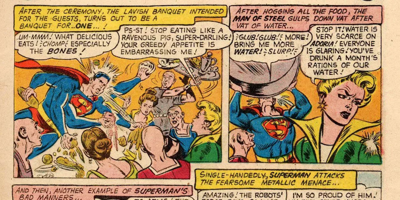 Superman también se come un banquete real entero él solo. Devora todo justo cuando todos están listos para comer, incluidos los huesos. También se bebe toda el agua, que por lo visto no tienen mucha en Adoria. Al final, Jena lo rechaza por considerarlo una amenaza. Lo peor es que la poción no hizo nada y Superman estaba siendo un idiota a propósito.