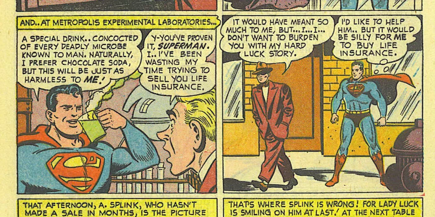 Superman estaba tan harto de que le vendieran seguros en 1951 que se esforzó por demostrar lo invulnerable que era. Superman recibió un disparo de un cañón, se sentó en un horno, se congeló a sí mismo, e incluso llegó a beber una gran taza de los microbios más mortíferos del mundo.
