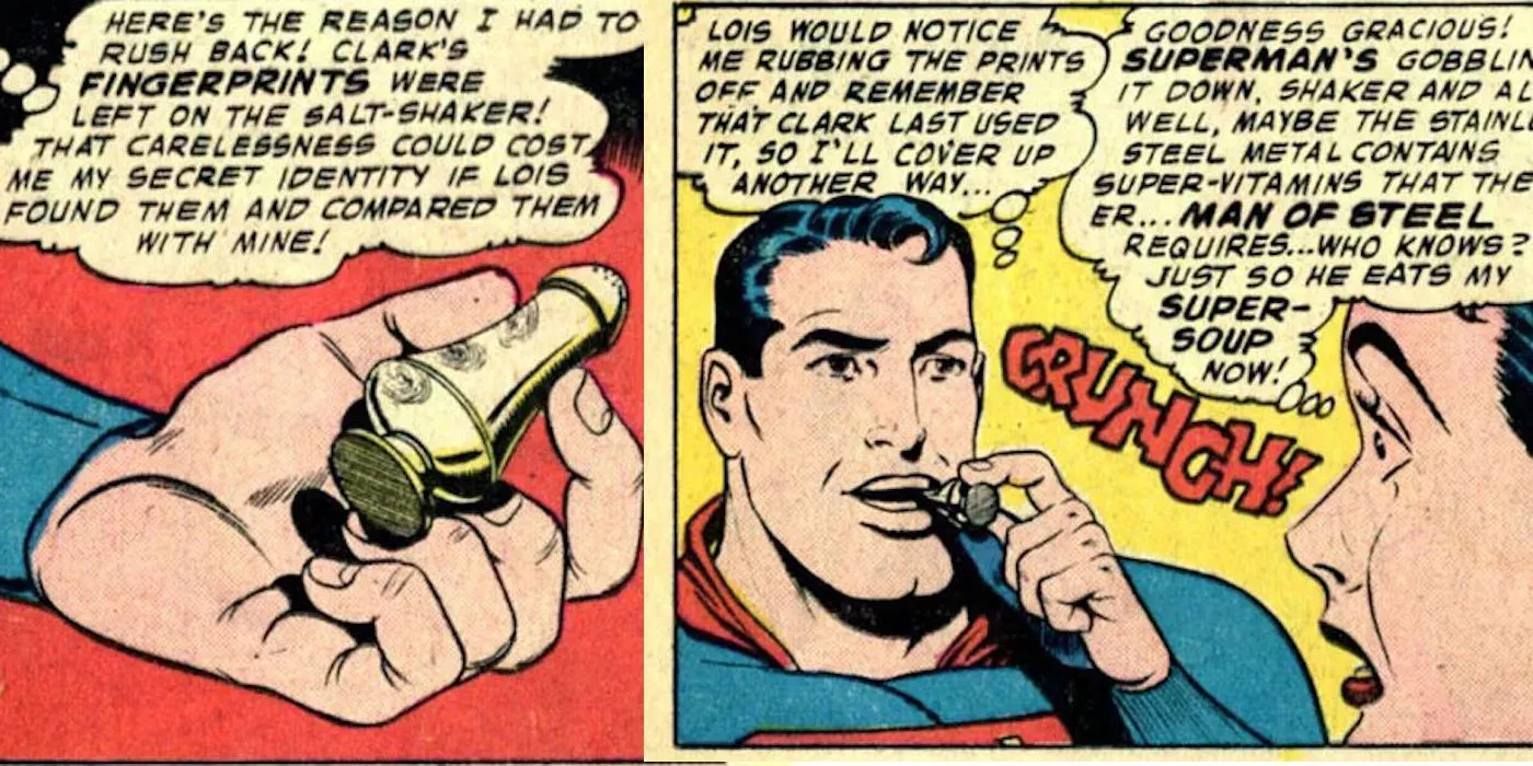En algún momento, Clark Kent come en la cafetería, pero pronto regresa como Superman para encubrir el hecho de que sus huellas dactilares quedaron en el salero. Cree que Lois las comparará con las de Superman y descubrirá la verdad. En lugar de limpiar las huellas dactilares, decide comérselo todo.