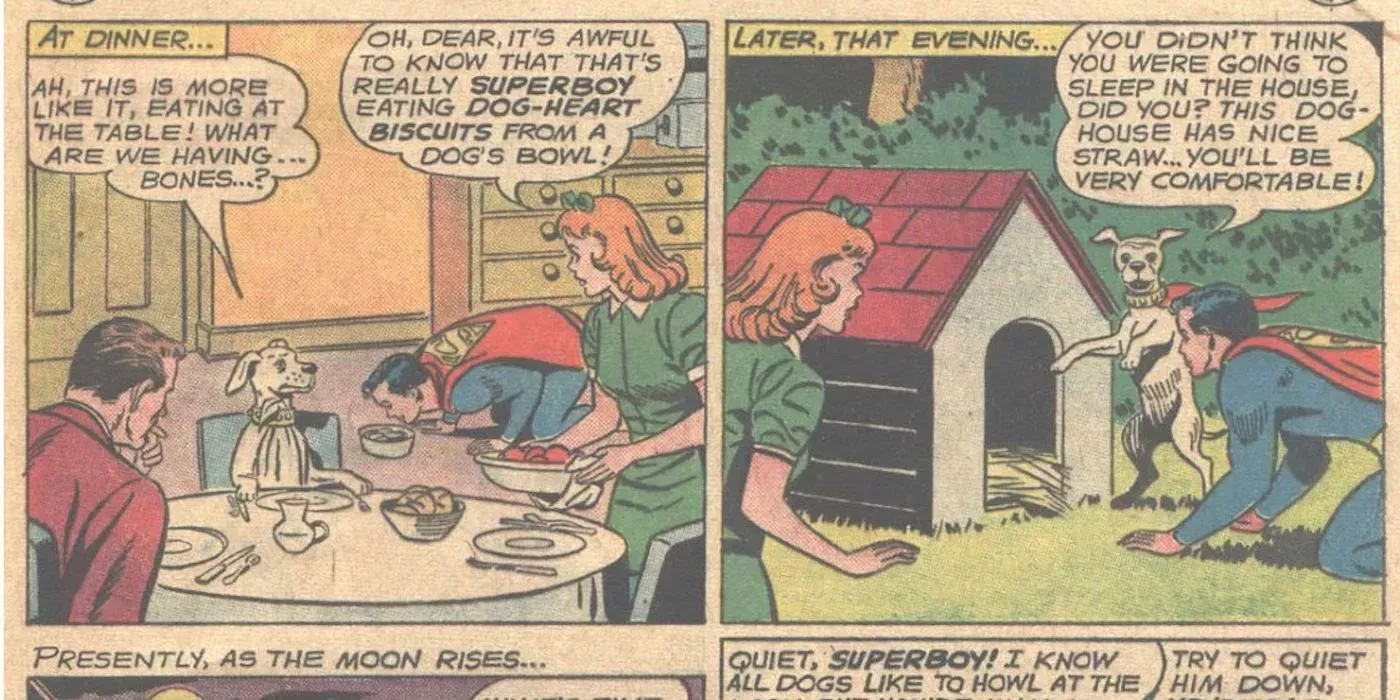 Superboy vive en una caseta de perro, sale a pasear y sigue los olores a cuatro patas, mientras su compañero come en la mesa y sujeta la correa. En un momento dado, Superboy se come un bol de galletas para perros, pero los lectores se enteraron de que los dos estaban fingiendo su intercambio mental todo el tiempo. La prueba resulta un poco incómoda, y ¿cómo pudo hablar Krypto?