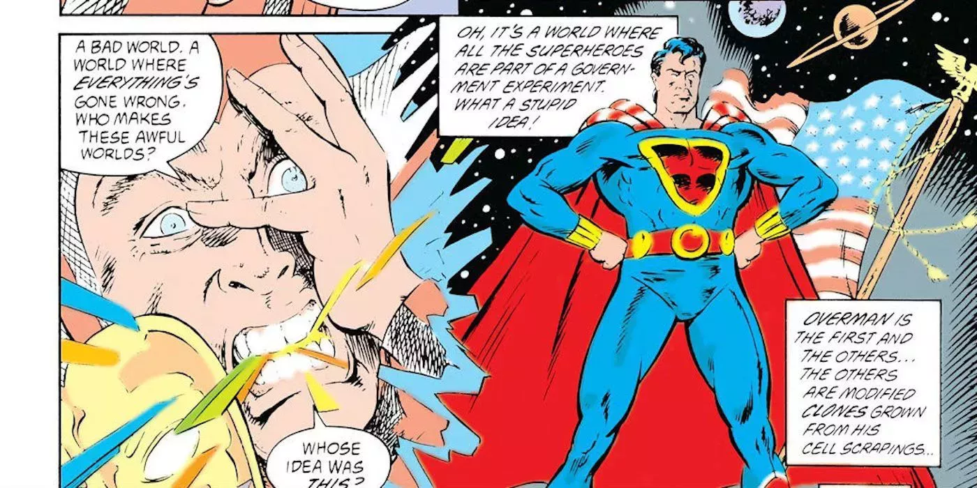 En la actualidad, Overman es una versión nazi de Superman, pero en 1991, Grant Morrison creó una versión malvada diferente del Hombre de Acero. El Psico-Pirata trajo de vuelta varios mundos que ya no existían tras la destrucción del multiverso. Fue una secuela suave de Crisis en Tierras Infinitas.