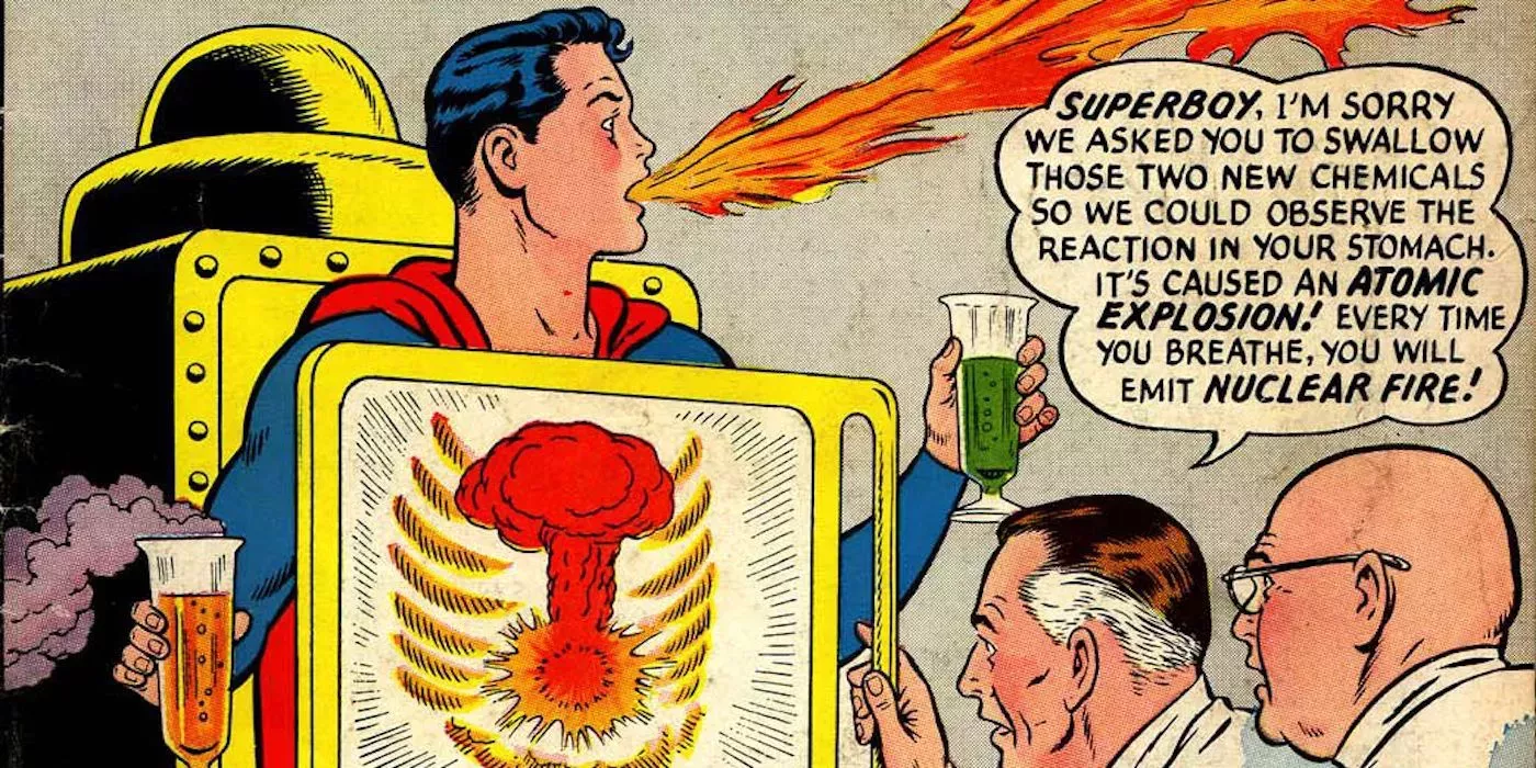 Clark bebió los dos productos químicos, que se mezclaron dentro de su estómago, y produjeron una reacción nuclear masiva. Durante el resto de la historia, Superboy tenía la capacidad de escupir fuego nuclear por la boca. Lo usó para hacer algo bueno antes de salvar la vida de un alienígena y pasarle la energía. Como si Superman no fuera lo suficientemente fuerte, al parecer también necesitaba aliento de fuego.