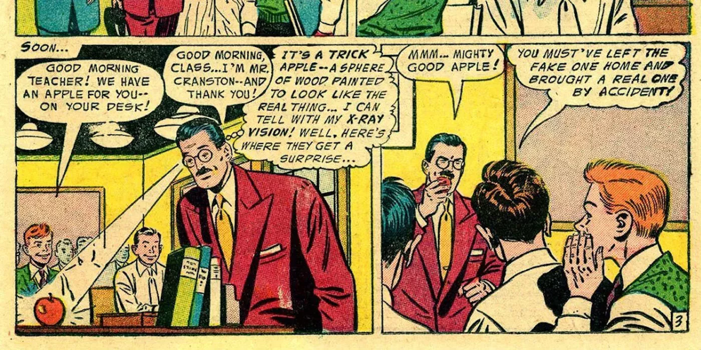 Con su nuevo disfraz, tiene el mismo aspecto que un profesor llamado Sr. Cranston y acaba siendo obligado a dar una clase en una escuela cercana. Los niños de la escuela, intentando gastar una broma a un profesor normal y sin superpoderes, le dan una manzana hecha de madera. Dadas sus habilidades, Superman puede notar la diferencia, pero decide comérsela de todos modos sólo para molestar a los niños. Fue todo un alboroto.