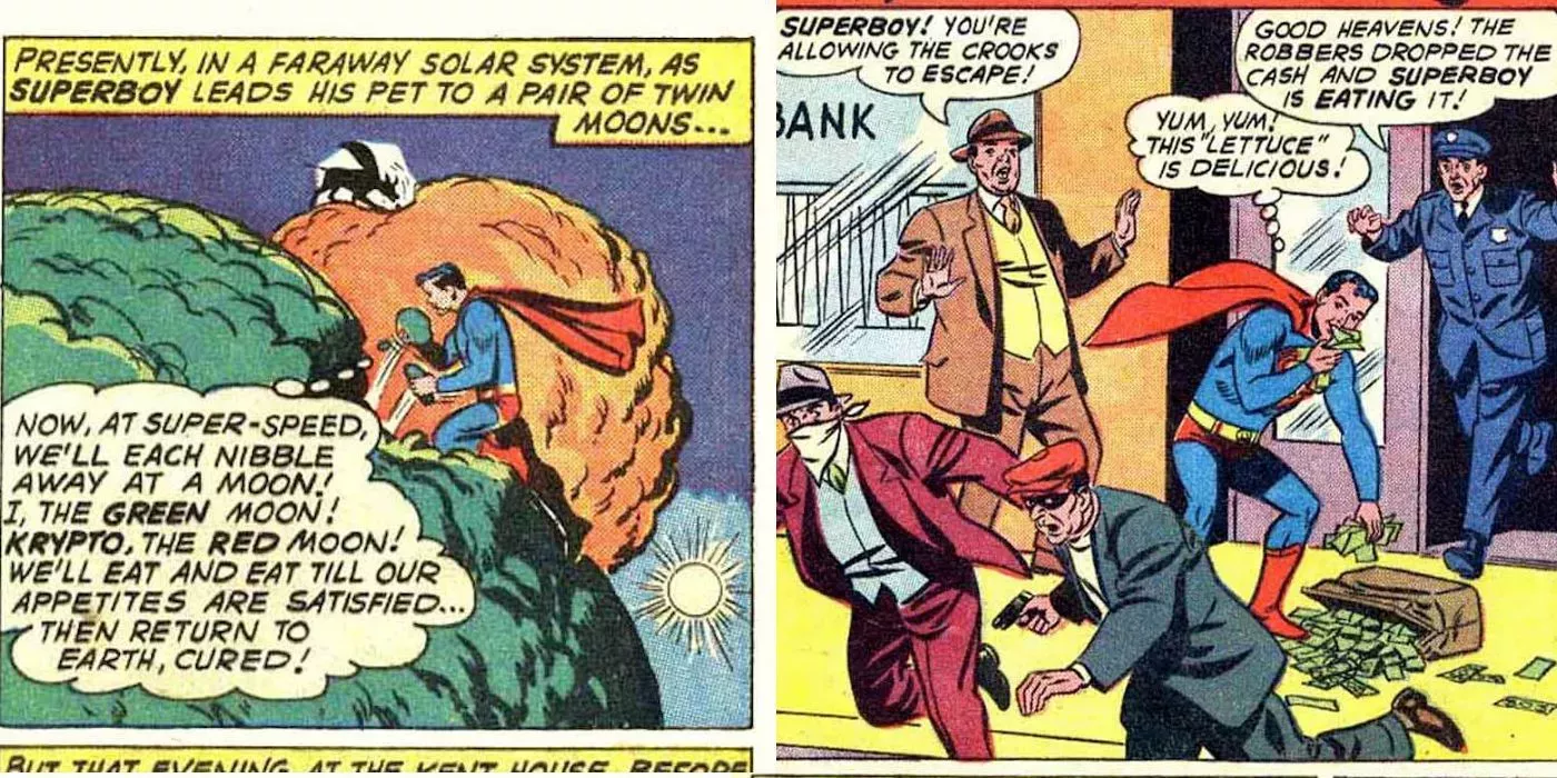 Durante su alboroto alimenticio, Clark acaba comiendo una matrícula verde, una valla verde, una alfombra verde, una lona verde y pintura verde. También detuvo el robo de un banco y se comió todo el dinero que estaban robando. Los dos sólo se curan cuando Superboy y Krypto aplacan sus apetitos devorando cada uno lunas verdes y rojas.