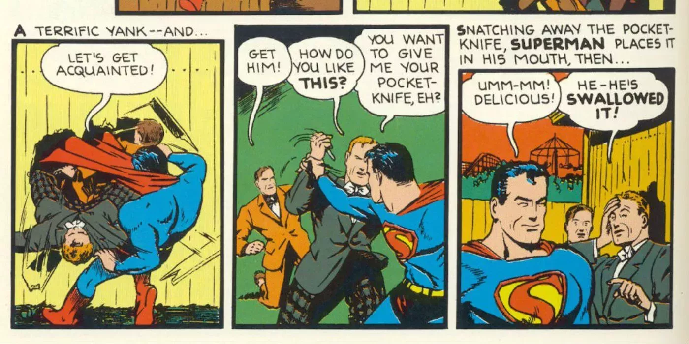 En una ocasión, roba la pistola a un delincuente, le dispara y detiene la bala antes de que le alcance. También se encuentra con soldados alemanes y destruye todo su campamento con sus propias manos. Por último, se enfrenta a un grupo de gángsters, y cuando uno de ellos le saca una navaja, Superman se la come entera.