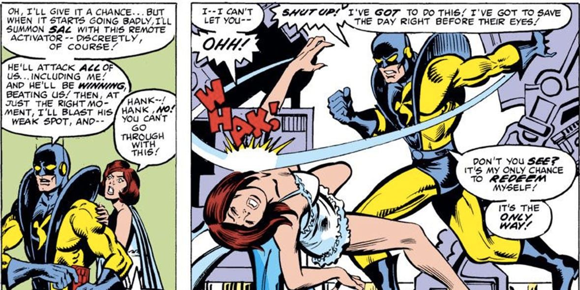 Ser Vengador debe ser un trabajo estresante. Cada día es el fin del mundo. Todo el mundo se muere, y luego vuelve, y luego muere de nuevo. La realidad siempre está cambiando. Eso no excusa el comportamiento de algunos de los miembros del equipo, en particular de Hank Pym. Hank tiene un historial de comportamiento problemático, que volveremos a revisar, pero lo peor tiene que ser el momento en que golpeó a su esposa, Janet Van Dyne, alias La Avispa.