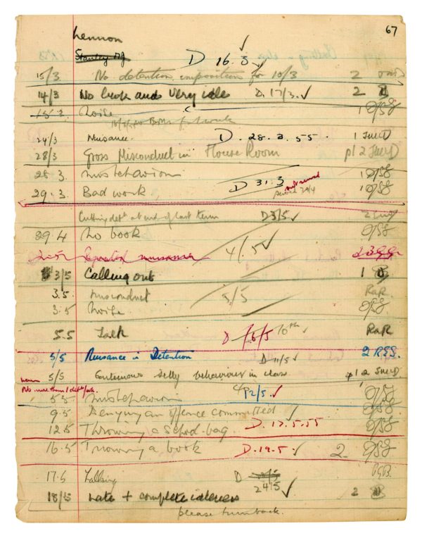 Su hoja de detención, de la escuela de gramática del Quarry Bank en los años 50, enumera las 22 detenciones de Lennon en menos de ocho semanas.