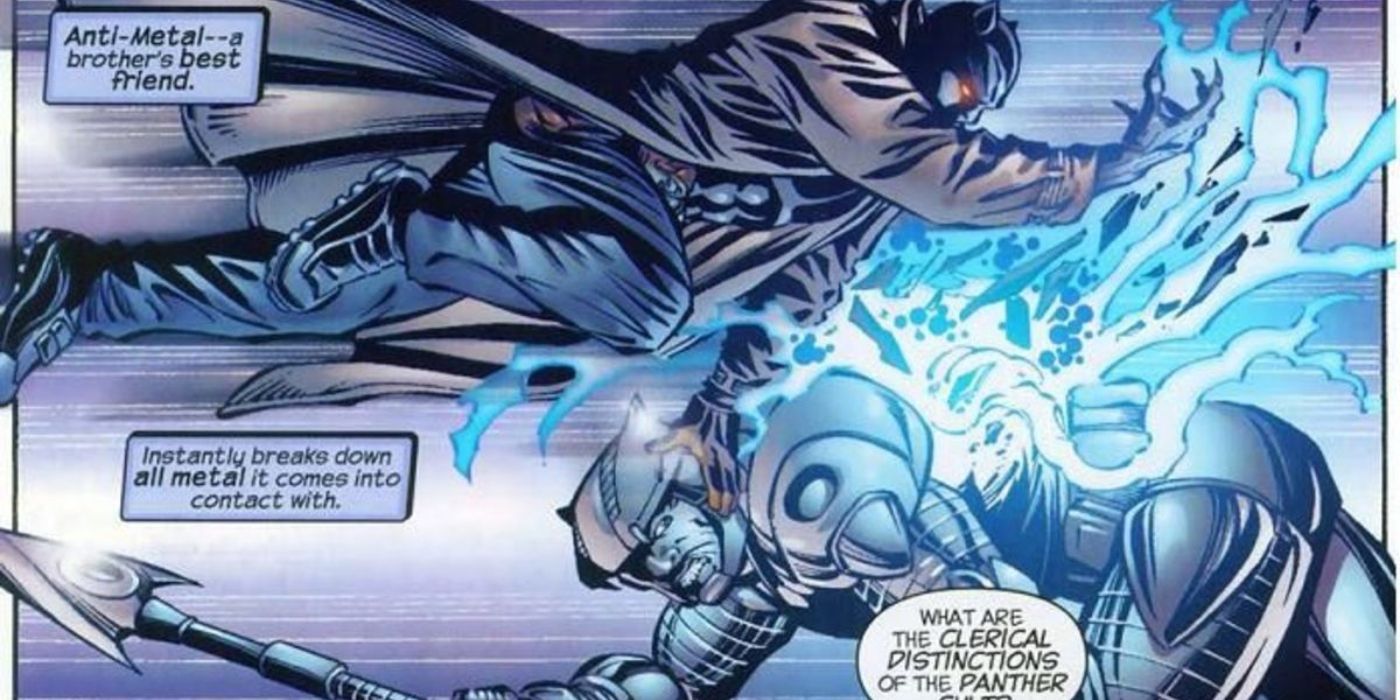 Pero el uso del Antimetal puede cambiar el juego. Con él, Pantera Negra podrÃa utilizar una minúscula cantidad de metal para desgastar lentamente a cualquier enemigo que utilice metal en sus ataques, descomponiendo aquello que lo hace poderoso hasta que todo lo que tenga que hacer sea destrozar las aberturas que ha hecho. El Anti-Metal bien podrÃa ser una sentencia de muerte para alguien como Iron Man o el Doctor Doom. Y esto sin tener en cuenta lo rara que es la sustancia en sÃ.
