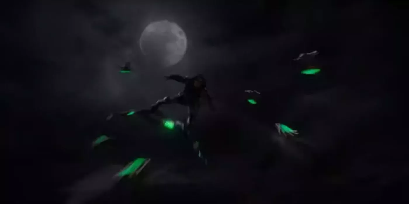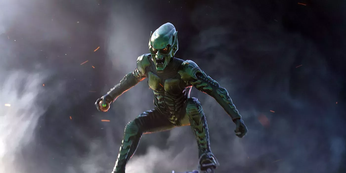 Entre la plétora de fragmentos del tráiler que no se ven, hay una imagen de una figura de pelo oscuro montada en una versión del planeador del Duende, lanzando armas verdes brillantes de alguna variedad desconocida. Podría ser el Harry Osborn de James Franco de las películas de Raimi o el Harry de Dane DeHaan de The Amazing Spider-Man 2. También podría ser el Duende de Dafoe sin su casco, o una variante del Duende que el público aún no ha visto.