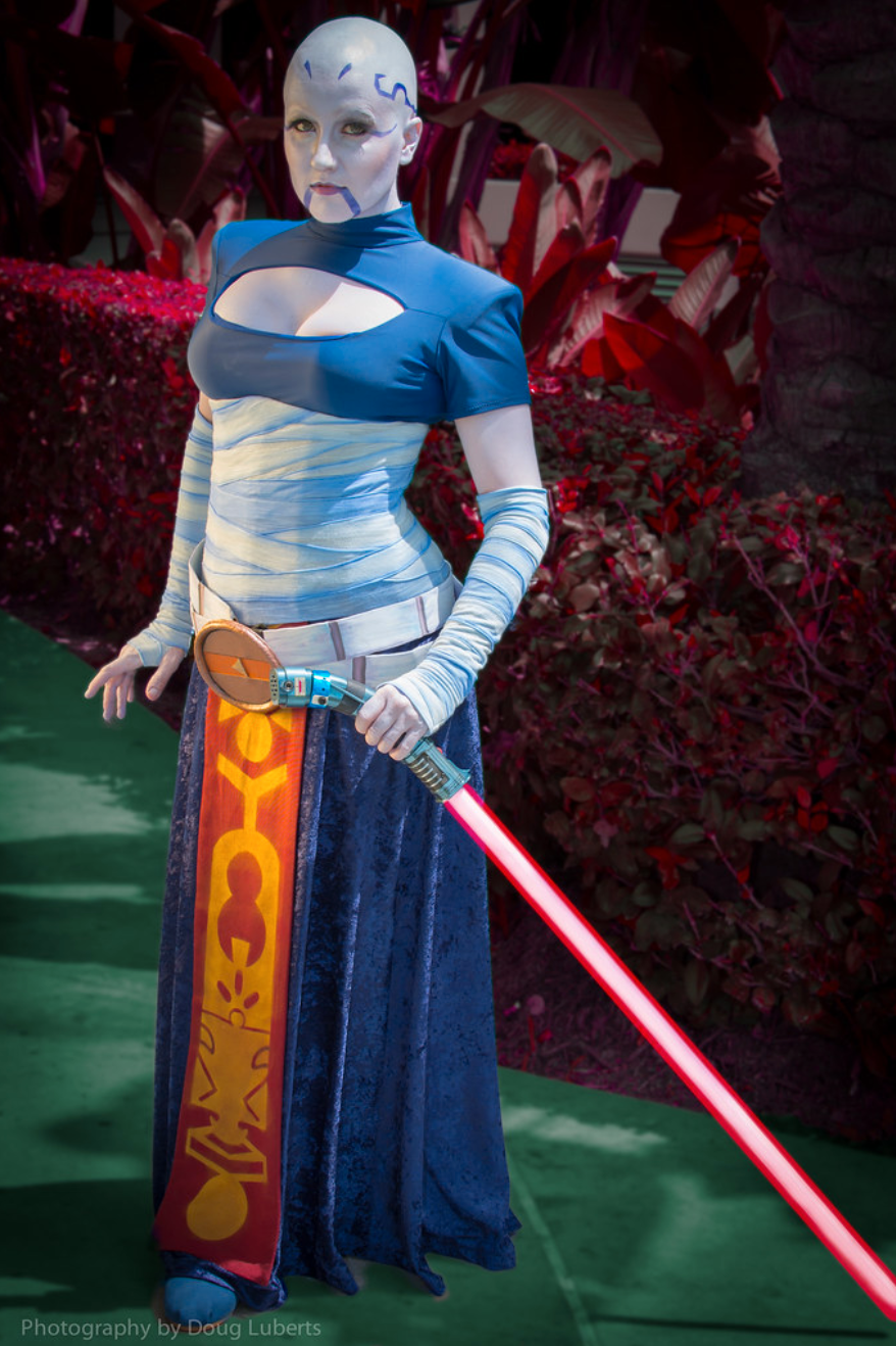 Otro ejemplo de un cosplayer usando materiales realistas, Asajj Ventress de Entropía se siente enraizada en el mundo en el que se supone que vive. La aplicación imperfecta del maquillaje hace que parezca un poco desparramada, que es algo con lo que un guerrero asesino tendría que lidiar en medio de la batalla.