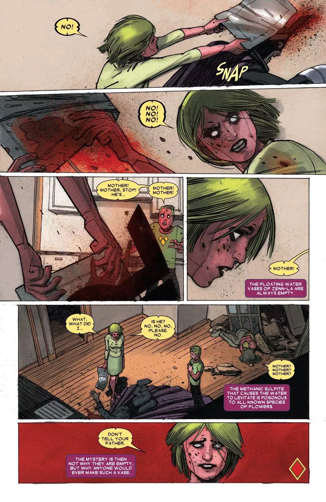 En uno de los números más fuertes de la historia, vemos la historia de la relación entre la Visión y la Bruja Escarlata y vemos los orígenes de la mente de Virginia y cómo, tal vez, eso jugó un papel en sus acciones. Ella era una madre amenazada por la pérdida de sus dos hijos -¿quién más conocemos que se volvió un poco loco después de perder a sus dos hijos?
