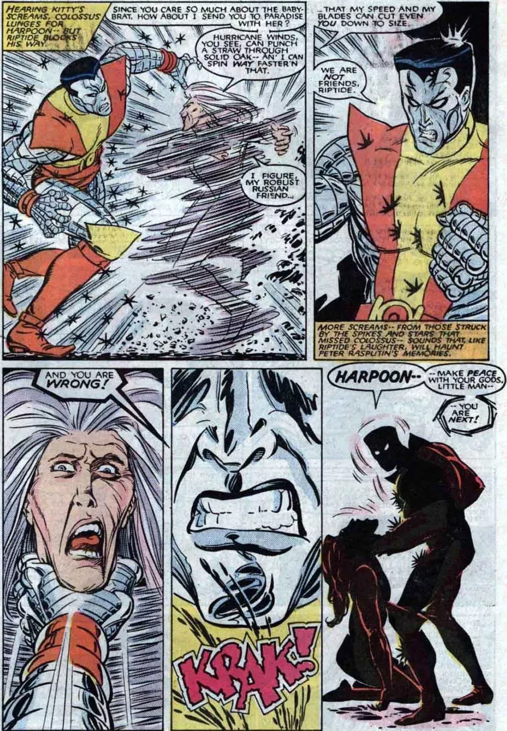 Esto llevó a uno de los momentos más dramáticos de la guerra, cuando el X-Man Colossus determinó que la única manera de detener a Riptide era usar la fuerza mortal. Mientras Riptide seguía golpeando el cuerpo metálico del X-Man con cuchillas, Coloso avanzó hasta que pudo romper el cuello de Riptide.